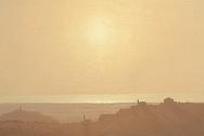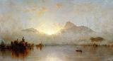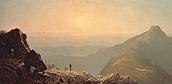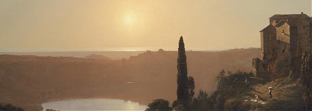 Lake Nemi (1856-57), a work that Gifford painted for exhibit in New York while in Italy, is the first of his paintings to have the sun as a focal point of the painting using light and tone to unifying and simply the landscape. This was to become a trademark of his work. We can trace his fascination with the transfiguring effects of light on the natural landscape throughout the exhibits in such works as A Gorge in the Mountains (1859) Mansfield Mountain (1859) and The Wilderness (1860).